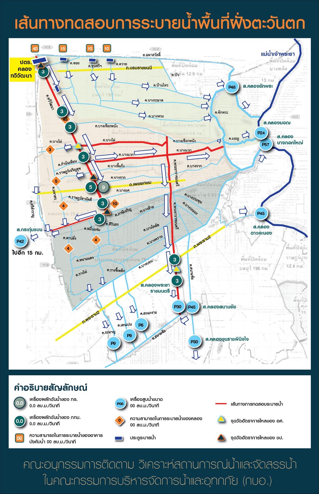 - ระดับน้ำในระบบคลองทวีวัฒนา และคลองพระยาราชมนตรี พบว่าระดับน้ำก่อนการทดสอบ ขณะทดสอบ และหลังการทดสอบอยู่ในเกณฑ์ควบคุม และไม่พบการล้นตลิ่ง